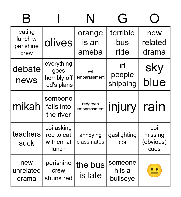 This bingo card has a free space and 24 words: coi asking red to eat w them at lunch, perishine crew shuns red, coi embarassment, new unrelated drama, new related drama, eating lunch w perishine crew, debate news, olives, injury, annoying classmates, irl people shipping, mikah, gaslighting coi, coi missing (obvious) cues, everything goes horribly off red's plans, someone hits a bullseye, rain, orange is an ameba, sky blue, someone falls into the river, 😐, teachers suck, terrible bus ride and the bus is late.