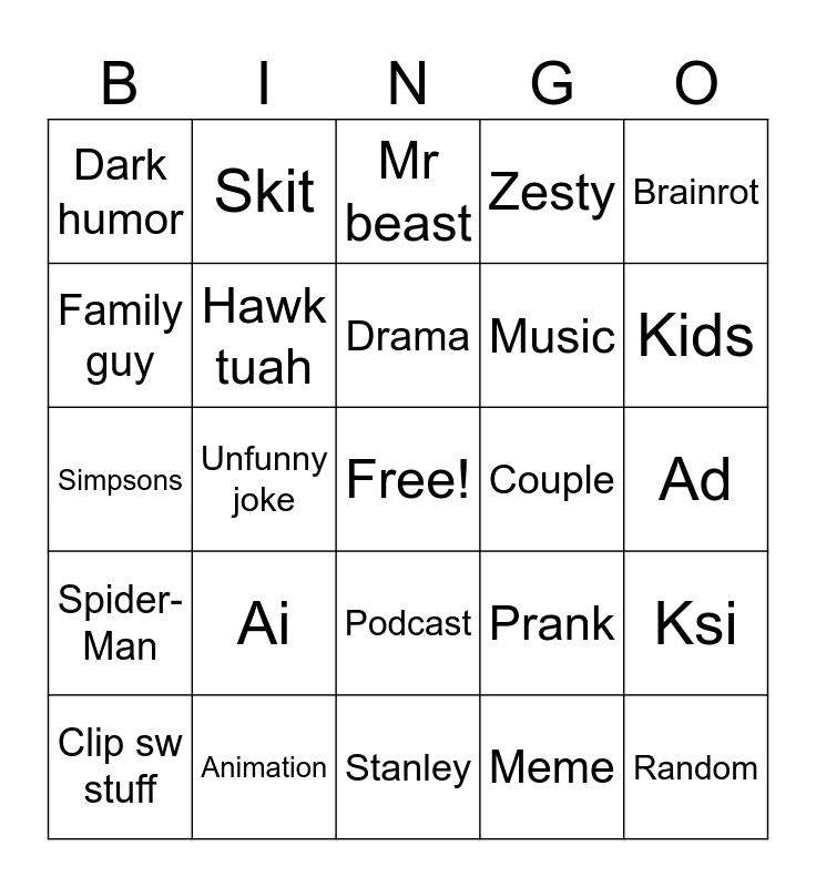 This bingo card has a free space and 24 words: Ai, Animation, Drama, Clip sw stuff, Brainrot, Dark humor, Family guy, Skit, Couple, Podcast, Music, Simpsons, Prank, Ksi, Hawk tuah, Meme, Ad, Mr beast, Kids, Unfunny joke, Random, Spider-Man, Zesty and Stanley.