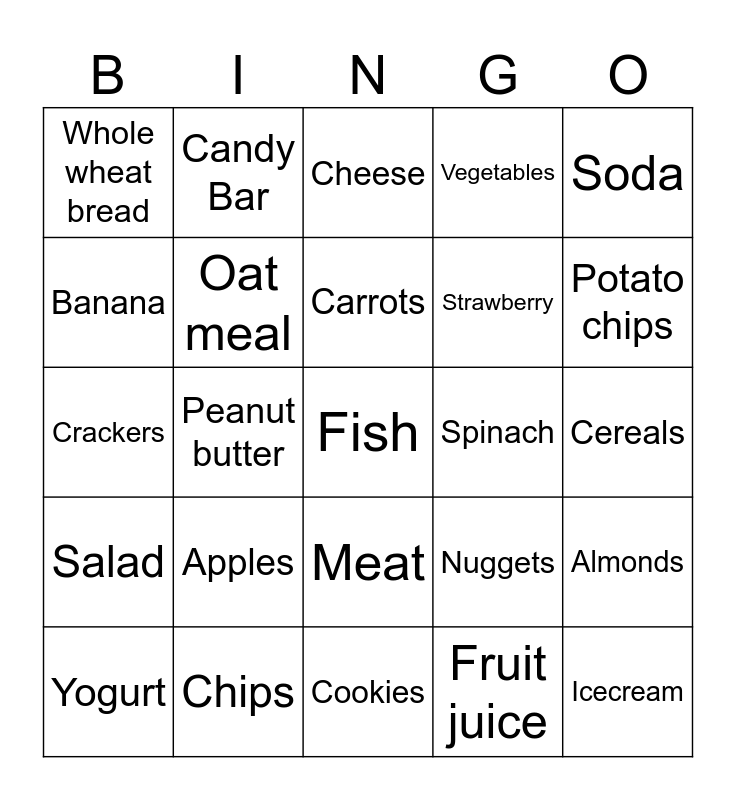This bingo card has a free space and 24 words: Apples, Chips, Carrots, Yogurt, Soda, Whole wheat bread, Banana, Candy Bar, Spinach, Meat, Strawberry, Crackers, Nuggets, Almonds, Oat meal, Fruit juice, Cereals, Cheese, Potato chips, Peanut butter, Icecream, Salad, Vegetables and Cookies.