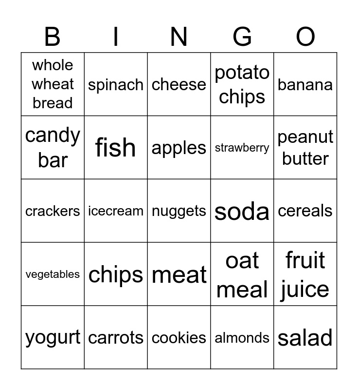This bingo card has a free space and 24 words: chips, carrots, apples, yogurt, banana, whole wheat bread, candy bar, spinach, soda, meat, strawberry, crackers, oat meal, fruit juice, fish, almonds, cereals, cheese, peanut butter, icecream, salad, vegetables, potato chips and cookies.