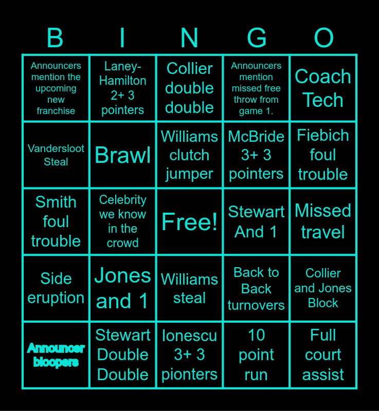 This bingo card has a free space and 24 words: Jones and 1, Stewart Double Double, Williams clutch jumper, Announcer bloopers, Coach Tech, Announcers mention the upcoming new franchise, Vandersloot Steal, Laney-Hamilton 2+ 3 pointers, Stewart And 1, Williams steal, McBride 3+ 3 pointers, Smith foul trouble, Back to Back turnovers, Collier and Jones Block, Brawl, 10 point run, Missed travel, Collier double double, Fiebich foul trouble, Celebrity we know in the crowd, Full court assist, Side eruption, Announcers mention missed free throw from game 1. and Ionescu 3+ 3 pionters.