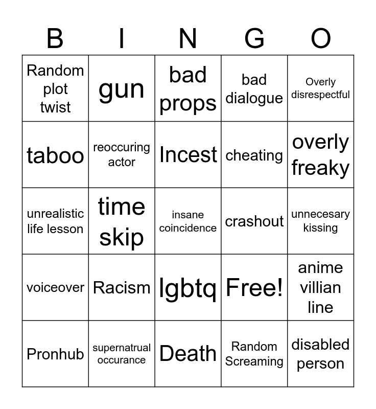 This bingo card has 25 words: Racism, Death, Incest, Pronhub, Overly disrespectful, Random plot twist, taboo, gun, crashout, lgbtq, cheating, unrealistic life lesson, Free!, anime villian line, reoccuring actor, disabled person, unnecesary kissing, bad props, overly freaky, time skip, insane coincidence, supernatrual occurance, voiceover, bad dialogue and Random Screaming.