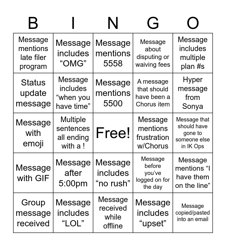 This bingo card has a free space and 24 words: Message after 5:00pm, Message includes “LOL”, Message mentions 5500, Group message received, Message includes multiple plan #s, Message mentions late filer program, Status update message, Message includes “OMG”, Message mentions frustration w/Chorus, Message includes “no rush”, A message that should have been a Chorus item, Message with emoji, Message before you’ve logged on for the day, Message mentions “I have them on the line”, Message includes “when you have time”, Message includes “upset”, Message that should have gone to someone else in IK Ops, Message mentions 5558, Hyper message from Sonya, Multiple sentences all ending with a !, Message copied/pasted into an email, Message with GIF, Message about disputing or waiving fees and Message received while offline.