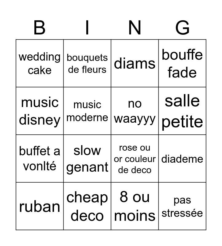 This bingo card has 16 words: cheap deco, diademe, diams, wedding cake, buffet a vonlté, bouquets de fleurs, rose ou or couleur de deco, 8 ou moins, music disney, music moderne, ruban, bouffe fade, slow genant, salle petite, no waayyy and pas stressée.