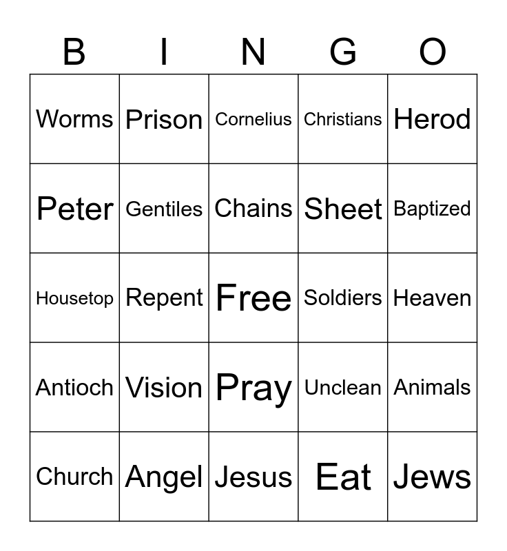 This bingo card has a free space and 24 words: Vision, Angel, Chains, Church, Herod, Worms, Peter, Prison, Soldiers, Pray, Sheet, Housetop, Unclean, Animals, Gentiles, Eat, Heaven, Cornelius, Baptized, Repent, Jews, Antioch, Christians and Jesus.