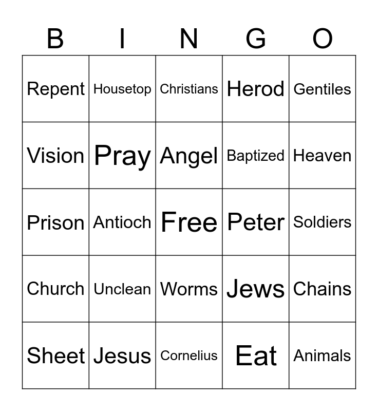 This bingo card has a free space and 24 words: Unclean, Jesus, Angel, Sheet, Gentiles, Repent, Vision, Housetop, Peter, Worms, Baptized, Prison, Jews, Chains, Pray, Eat, Soldiers, Christians, Heaven, Antioch, Animals, Church, Herod and Cornelius.