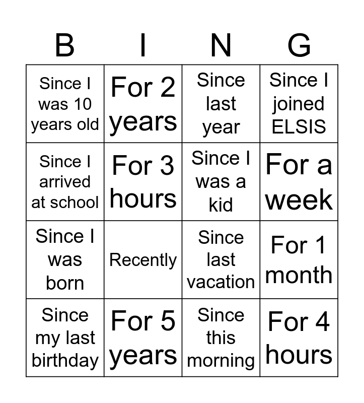 This bingo card has 16 words: For 5 years, For 1 month, Since last year, Since I was 10 years old, Since I was born, For 2 years, Since last vacation, Since this morning, Since I arrived at school, For 3 hours, Since my last birthday, Since I joined ELSIS, Recently, For a week, Since I was a kid and For 4 hours.