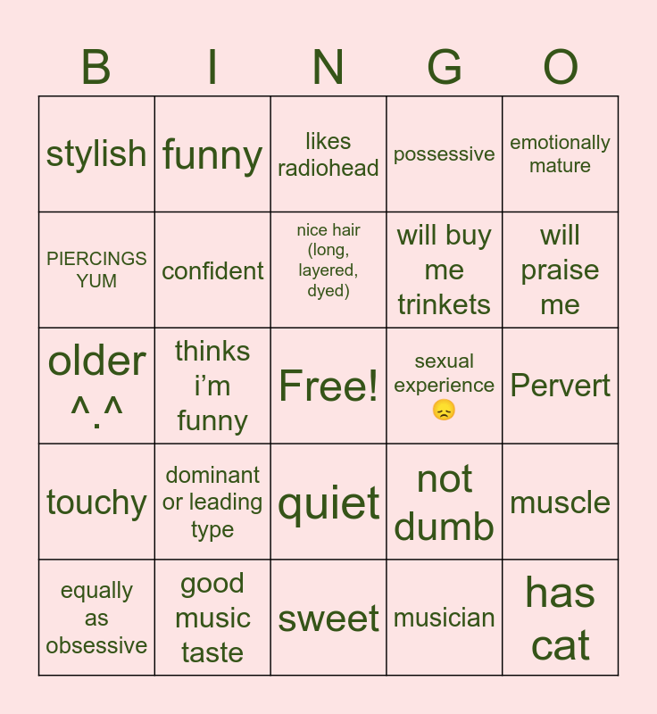 This bingo card has a free space and 24 words: dominant or leading type, good music taste, nice hair (long, layered, dyed), equally as obsessive, emotionally mature, stylish, PIERCINGS YUM, funny, sexual experience 😞, quiet, will buy me trinkets, older ^.^, not dumb, muscle, confident, musician, Pervert, likes radiohead, will praise me, thinks i’m funny, has cat, touchy, possessive and sweet.