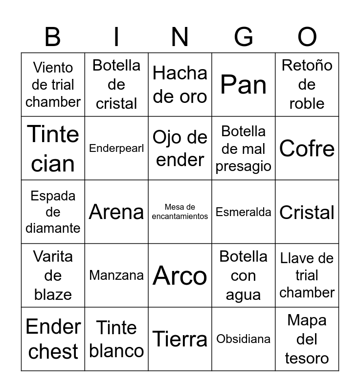 This bingo card has a free space and 24 words: Manzana, Tinte blanco, Ojo de ender, Ender chest, Retoño de roble, Viento de trial chamber, Tinte cian, Botella de cristal, Esmeralda, Arco, Botella de mal presagio, Espada de diamante, Botella con agua, Llave de trial chamber, Enderpearl, Obsidiana, Cristal, Hacha de oro, Cofre, Arena, Mapa del tesoro, Varita de blaze, Pan and Tierra.