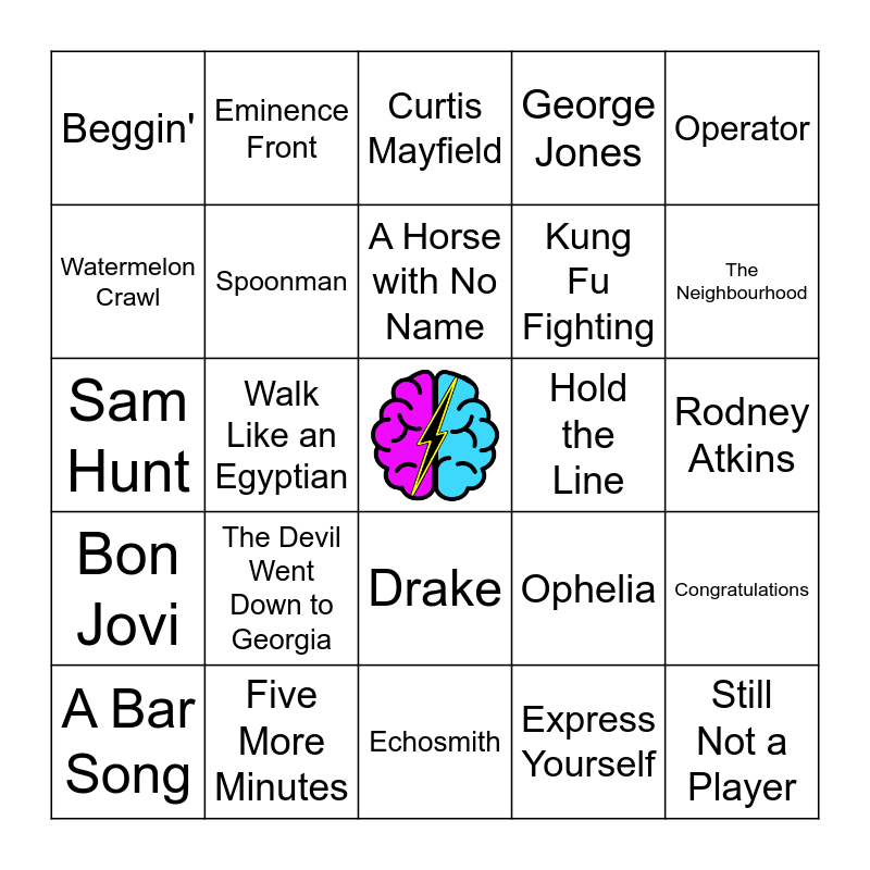 This bingo card has a free space and 53 words: Waterfalls, Still Not a Player, Planet Rock, Express Yourself, The Devil Went Down to Georgia, Dancing in the Moonlight, Eminence Front, Send Me On My Way, Watermelon Crawl, Shine, Spoonman, Black Magic Woman, Congratulations, Ophelia, Espresso, A Bar Song, A Horse with No Name, Hold the Line, Gimme! Gimme! Gimme!, Operator, Walk Like an Egyptian, That's the Way (I Like It), Kung Fu Fighting, Beggin', Daddy Cool, Five More Minutes, Smoke A Little Smoke, Beer In Mexico, Rascal Flatts, The Neighbourhood, Darius Rucker, MAGIC!, Zac Brown Band, Gorillaz, Mel McDaniel, Foster The People, George Jones, Echosmith, Curtis Mayfield, Fitz and The Tantrums, The Rolling Stones, Rage Against The Machine, Rodney Atkins, HIXTAPE, HARDY, Kendrick Lamar, Drake, Beyoncé, OneRepublic, Sam Hunt, Bon Jovi, Kip Moore, Dr. Dre and Outkast.