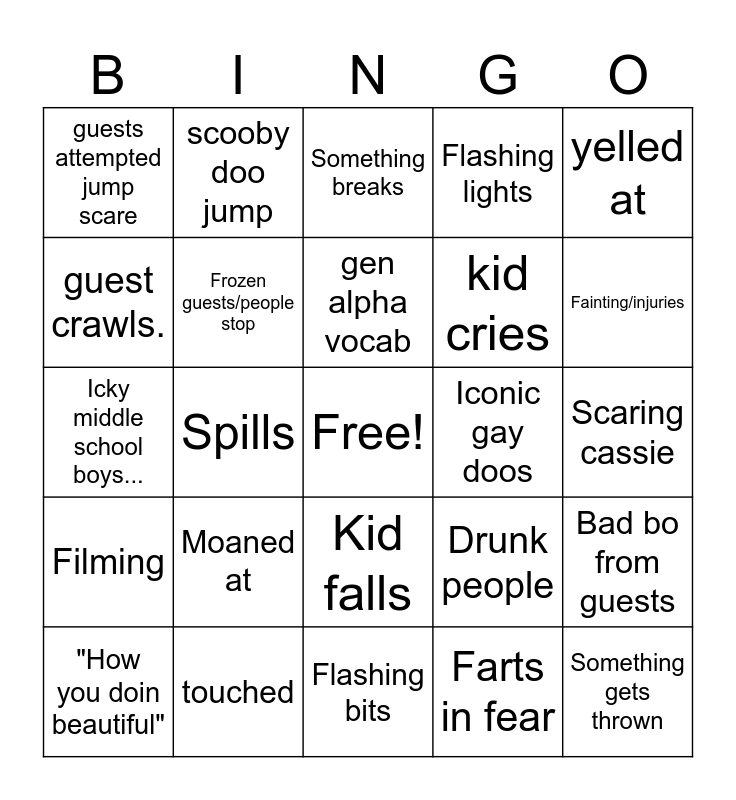 This bingo card has a free space and 24 words: Moaned at, touched, gen alpha vocab, "How you doin beautiful", yelled at, guests attempted jump scare, guest crawls., scooby doo jump, Iconic gay doos, Kid falls, kid cries, Icky middle school boys..., Drunk people, Bad bo from guests, Frozen guests/people stop, Farts in fear, Scaring cassie, Something breaks, Fainting/injuries, Spills, Something gets thrown, Filming, Flashing lights and Flashing bits.