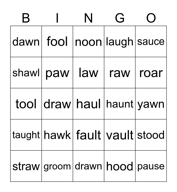 This bingo card has a free space and 39 words: caught, lawn, cause, paw, straw, fault, law, claw, sauce, taught, draw, laugh, pause, yawn, haunt, hawk, crawl, dawn, launch, vault, shawl, drawn, raw, roar, pour, roast, good, cool, crook, fool, wood, could, noon, groom, hood, root, stood, tool and hook.
