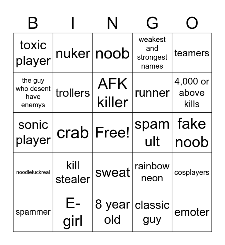 This bingo card has a free space and 24 words: kill stealer, E-girl, AFK killer, spammer, teamers, toxic player, the guy who desent have enemys, nuker, spam ult, sweat, runner, sonic player, rainbow neon, cosplayers, trollers, classic guy, fake noob, noob, 4,000 or above kills, crab, emoter, noodleluckreal, weakest and strongest names and 8 year old.