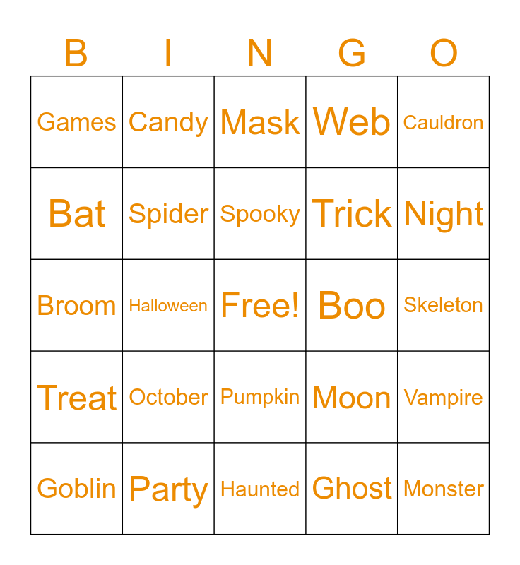 This bingo card has a free space and 26 words: Pumpkin, Ghost, Spooky, Party, Cauldron, Games, Bat, Candy, Skeleton, Moon, Trick, Broom, Vampire, Goblin, Halloween, Bones, Web, Treat, Mask, Monster, Night, Haunted, Boo, October, Spider and Costume.