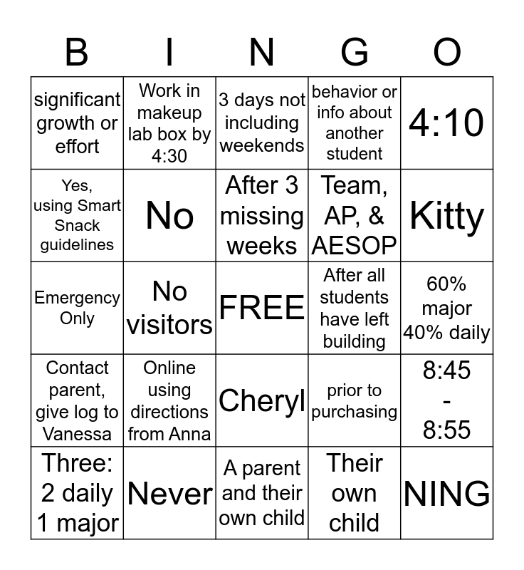 This bingo card has a free space and 24 words: Online using directions from Anna, Never, After 3 missing weeks, Three: 2 daily 1 major, 4:10, significant growth or effort, Yes, using Smart Snack guidelines, Work in makeup lab box by 4:30, After all students have left building, Cheryl, Team, AP, & AESOP, Emergency Only, prior to purchasing, 8:45 - 8:55, No, Their own child, 60% major 40% daily, 3 days not including weekends, Kitty, No visitors, NING, Contact parent, give log to Vanessa, behavior or info about another student and A parent and their own child.