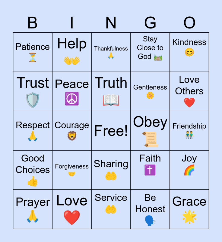 This bingo card has a free space and 24 words: Forgiveness 🤝, Love ❤️, Truth 📖, Prayer 🙏, Kindness 😊, Patience ⏳, Trust 🛡️, Help 👐, Obey 📜, Sharing 🤲, Gentleness 🌼, Respect 🙏, Faith ✝️, Joy 🌈, Peace ☮️, Be Honest 🗣️, Friendship 👬, Thankfulness 🙏, Love Others ❤️, Courage 🦁, Grace 🌟, Good Choices 👍, Stay Close to God 🛤️ and Service 🤲.