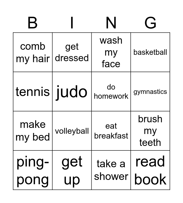 This bingo card has 16 words: get up, brush my teeth, wash my face, comb my hair, make my bed, get dressed, eat breakfast, take a shower, tennis, judo, ping-pong, basketball, volleyball, gymnastics, do homework and read book.