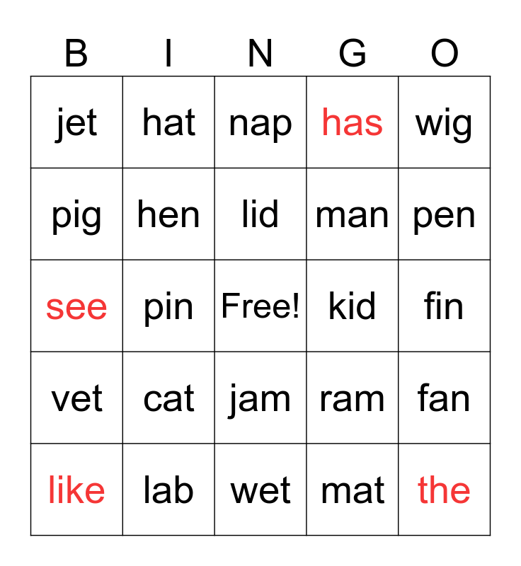 This bingo card has a free space and 24 words: cat, lab, lid, like, wig, jet, pig, hat, kid, jam, man, see, ram, fan, hen, mat, fin, nap, pen, pin, the, vet, has and wet.