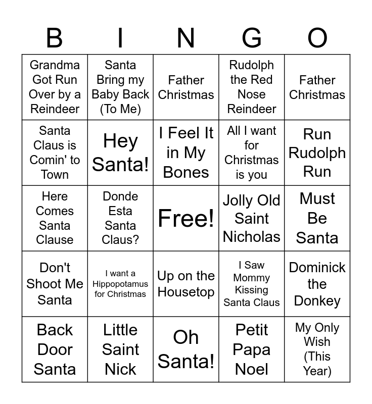 This bingo card has a free space and 29 words: Back Door Santa, The Christmas Song, Donde Esta Santa Claus?, (Everybody's waitin' for) The Man with the Bag, Grandma Got Run Over by a Reindeer, Father Christmas, Hey Santa!, I want a Hippopotamus for Christmas, Jolly Old Saint Nicholas, Little Saint Nick, Must Be Santa, My Only Wish (This Year), Oh Santa!, Petit Papa Noel, Run Rudolph Run, Santa Baby, Up on the Housetop, Don't Shoot Me Santa, Father Christmas, Here Comes Santa Clause, I Saw Mommy Kissing Santa Claus, Silver Bells, All I want for Christmas is you, Santa Claus is Comin' to Town, Rudolph the Red Nose Reindeer, Santa Bring my Baby Back (To Me), Dominick the Donkey, I Feel It in My Bones and Joel the Lump of Coal.