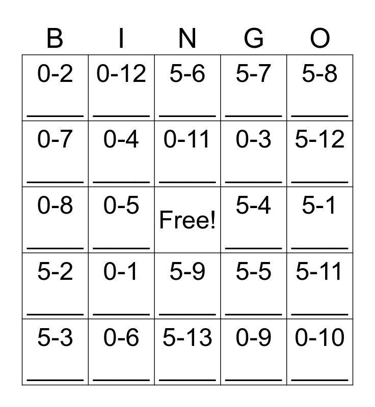 This bingo card has a free space and 24 words: 0-1 ____, 0-6 ____, 0-11 ____, 5-3 ____, 5-8 ____, 0-2 ____, 0-7 ____, 0-12 ____, 5-4 ____, 5-9 ____, 0-3 ____, 0-8 ____, 5-5 ____, 5-11 ____, 0-4 ____, 0-9 ____, 5-1 ____, 5-6 ____, 5-12 ____, 0-5 ____, 0-10 ____, 5-2 ____, 5-7 ____ and 5-13 ____.