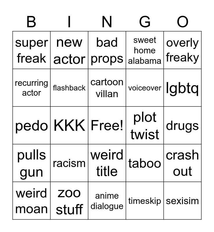 This bingo card has a free space and 24 words: racism, zoo stuff, cartoon villan, weird moan, overly freaky, super freak, recurring actor, new actor, plot twist, weird title, voiceover, pedo, taboo, crash out, flashback, timeskip, drugs, bad props, lgbtq, KKK, sexisim, pulls gun, sweet home alabama and anime dialogue.