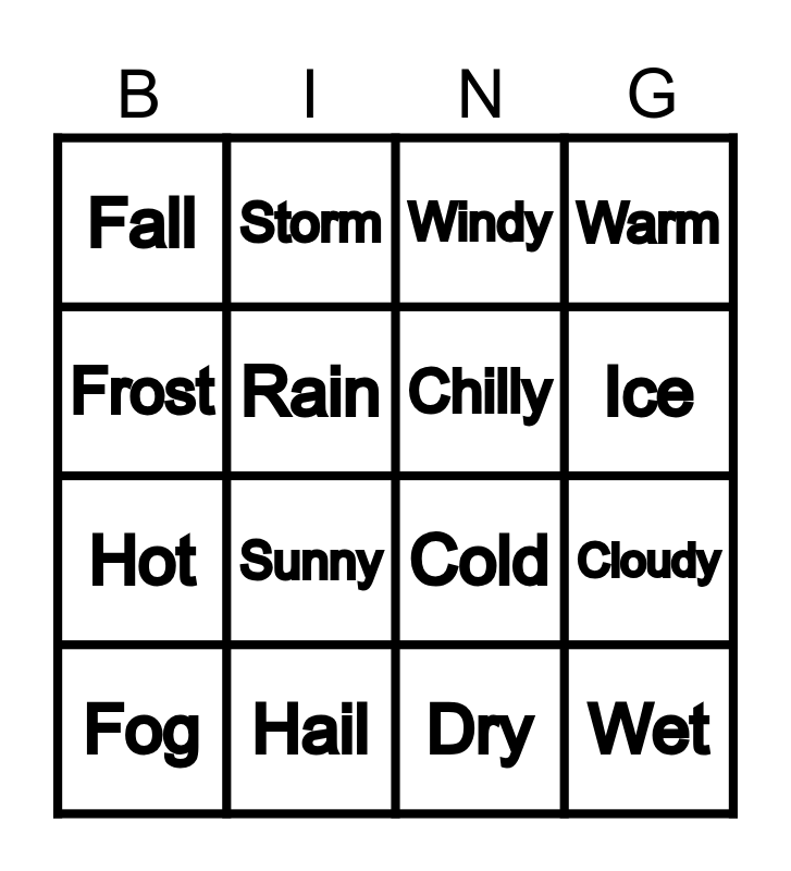 This bingo card has 16 words: Hail, Cloudy, Windy, Fall, Hot, Storm, Cold, Dry, Frost, Rain, Fog, Warm, Sunny, Ice, Chilly and Wet.