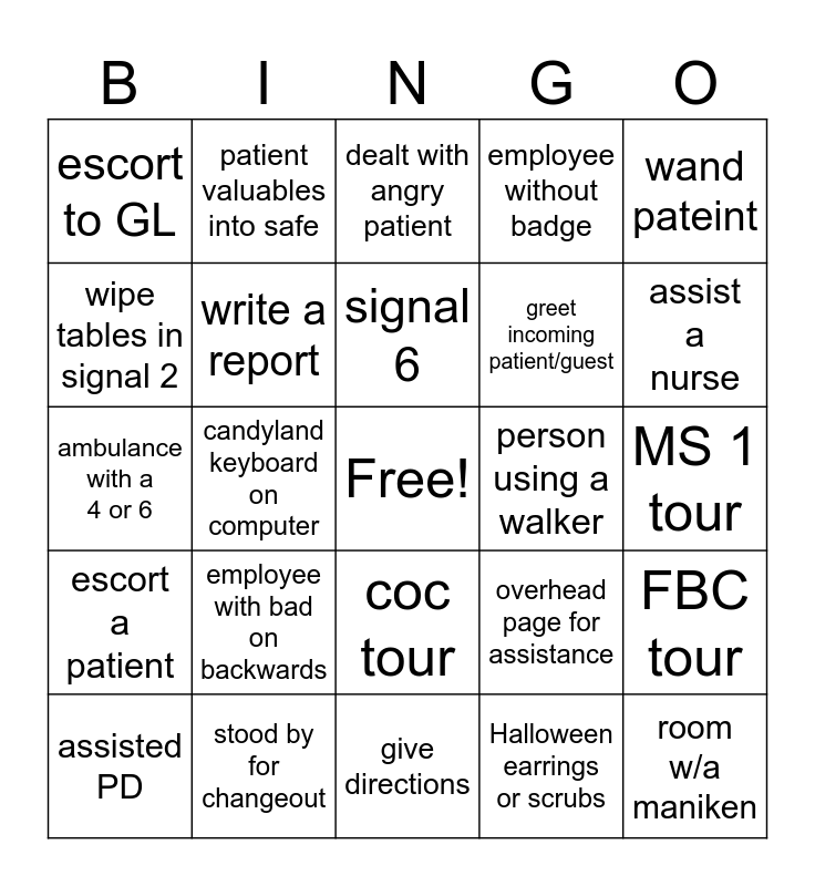 This bingo card has a free space and 24 words: employee with bad on backwards, stood by for changeout, signal 6, assisted PD, wand pateint, escort to GL, wipe tables in signal 2, patient valuables into safe, person using a walker, coc tour, greet incoming patient/guest, ambulance with a 4 or 6, overhead page for assistance, FBC tour, write a report, Halloween earrings or scrubs, MS 1 tour, dealt with angry patient, assist a nurse, candyland keyboard on computer, room w/a maniken, escort a patient, employee without badge and give directions.