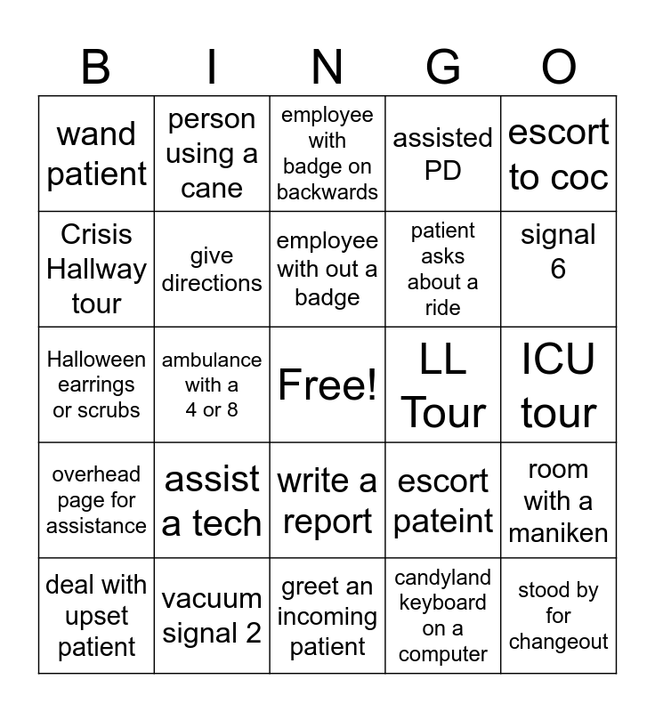 This bingo card has a free space and 24 words: assist a tech, vacuum signal 2, employee with out a badge, deal with upset patient, escort to coc, wand patient, Crisis Hallway tour, person using a cane, LL Tour, write a report, patient asks about a ride, Halloween earrings or scrubs, escort pateint, room with a maniken, give directions, candyland keyboard on a computer, ICU tour, employee with badge on backwards, signal 6, ambulance with a 4 or 8, stood by for changeout, overhead page for assistance, assisted PD and greet an incoming patient.