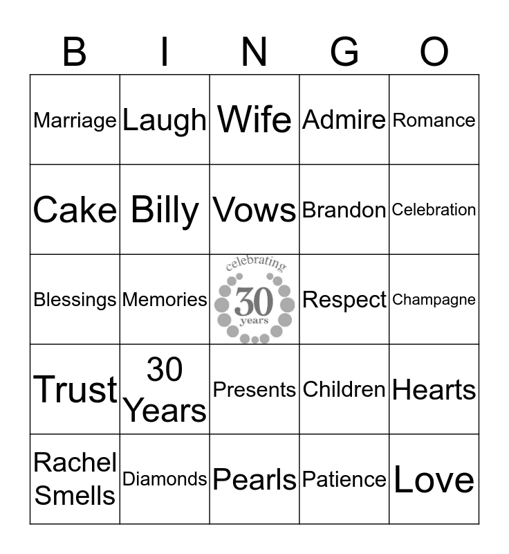 This bingo card has a free space and 24 words: 30 Years, Diamonds, Vows, Rachel Smells, Romance, Marriage, Cake, Laugh, Respect, Presents, Brandon, Blessings, Children, Hearts, Billy, Patience, Champagne, Wife, Celebration, Memories, Love, Trust, Admire and Pearls.