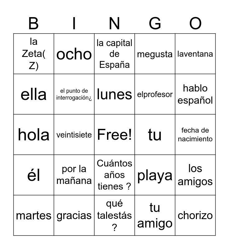 This bingo card has a free space and 55 words: siesta, martes, yo, la Zeta( Z), qué talestás ?, Guadalajara, el punto de interrogación¿, cinco, elprofesor, la ñ, megusta, hermano(a), mi, adios, nosotras, la Jota( J), laventana, veintisiete, soy un alumno, chorizo, tu, domingo, playa, la capital de España, buenastardes, lunes, tu amigo, usted, fecha de nacimiento, los amigos, el alfabeto, nosotros, por favor, la tercera lengua del mundo, ella, hola, mi nacionalidad es ..., él, flamenco, Donde vives ?, ocho, cumpleaños, abre la puerta, hasta pronto, por la mañana, gracias, Cómo te llamas ?, octubre, apellido, hablo español, el cuaderno de español, la clase de español, cuarenta y seis, Cuántos años tienes ? and septiembre.