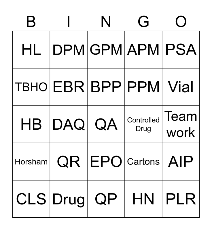This bingo card has a free space and 24 words: QR, Drug, BPP, CLS, PSA, HL, TBHO, DPM, Controlled Drug, EPO, PPM, HB, Cartons, AIP, EBR, HN, Team work, GPM, Vial, DAQ, PLR, Horsham, APM and QP.