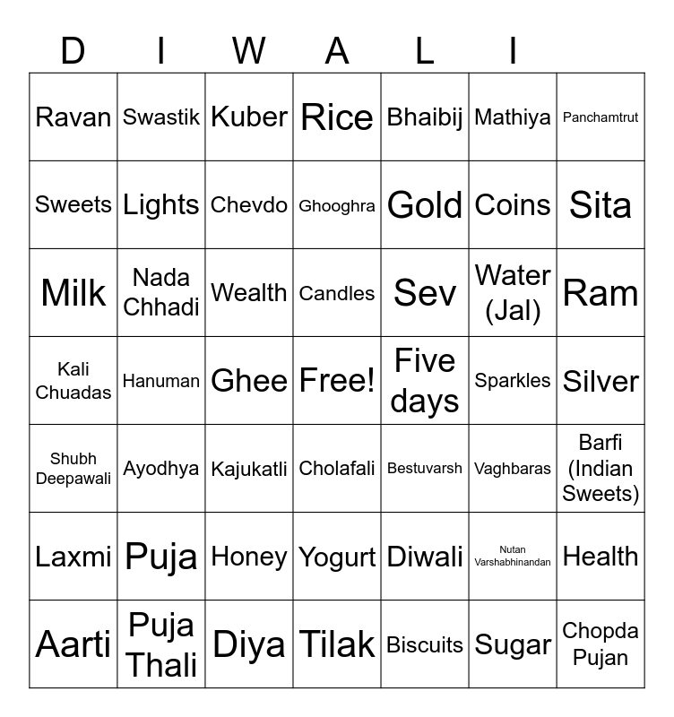 This bingo card has a free space and 77 words: Om, Laxmi, Kuber, Diwali, Fireworks, Dhanteras, Vaghbaras, Annakut, Bestuvarsh, Dhan Pujan, Chopda Pujan, Crackers, Sweets, Mathiya, Suvari, Gold, Silver, Coins, Money, Bhaibij, Cholafali, Ghooghra, Panchamtrut, Swastik, Rice, Tilak, Aarti, Diya, Dipawali, Blessing, Kajukatli, Ladoo, Nankhatai, Sev, Chevdo, Lights, Decoration, Cleaning, Milk, Ghee, Yogurt, Honey, Sugar, Haldi, Kumkum, Five days, Ram, Ravan, Rangoli, Colorful, Sparkles, Candles, Dry Fruits, Barfi (Indian Sweets), Biscuits, Silver Coin, Shubh Deepawali, Nutan Varshabhinandan, Mandir, Health, Wealth, Ganesh, Gold Coin, Art, Gifts, Puja, Flowers, Sita, Ayodhya, Lanka, Puja Thali, Water (Jal), Nada Chhadi, Kali Chuadas, Oil, Hanuman and Chakri.