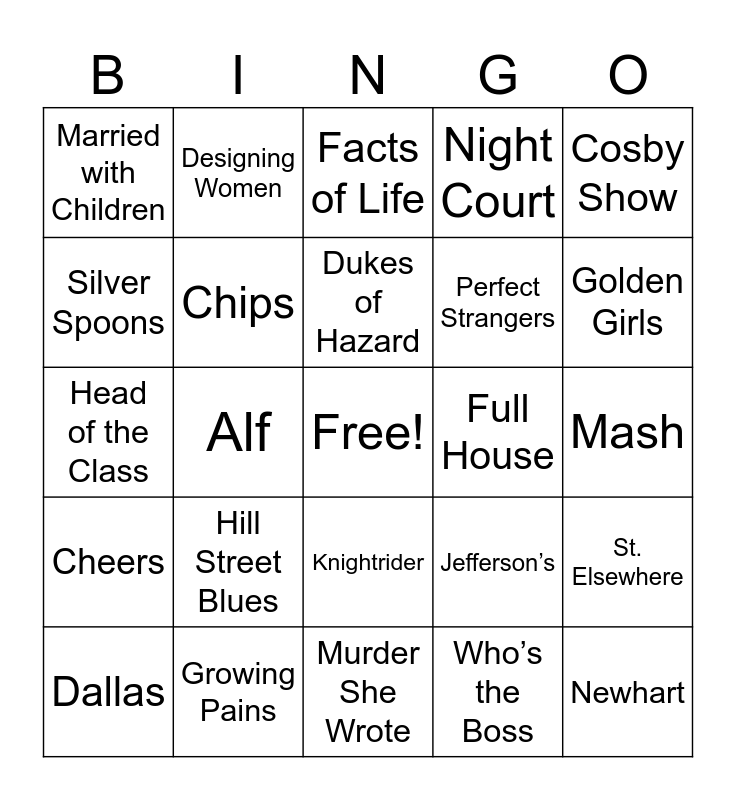This bingo card has a free space and 33 words: 227, A Team, Alf, Cagney and Lacey, Cheers, Chips, Cosby Show, Dallas, Designing Women, Different World, Dukes of Hazard, Facts of Life, Family Ties, Fraggle Rock, Full House, Golden Girls, Growing Pains, Head of the Class, Hill Street Blues, Jefferson’s, Knightrider, Magnum PI, Married with Children, Mash, Murder She Wrote, Newhart, Night Court, Perfect Strangers, Silver Spoons, St. Elsewhere, Three’s Company, Who’s the Boss and Wonder Year.