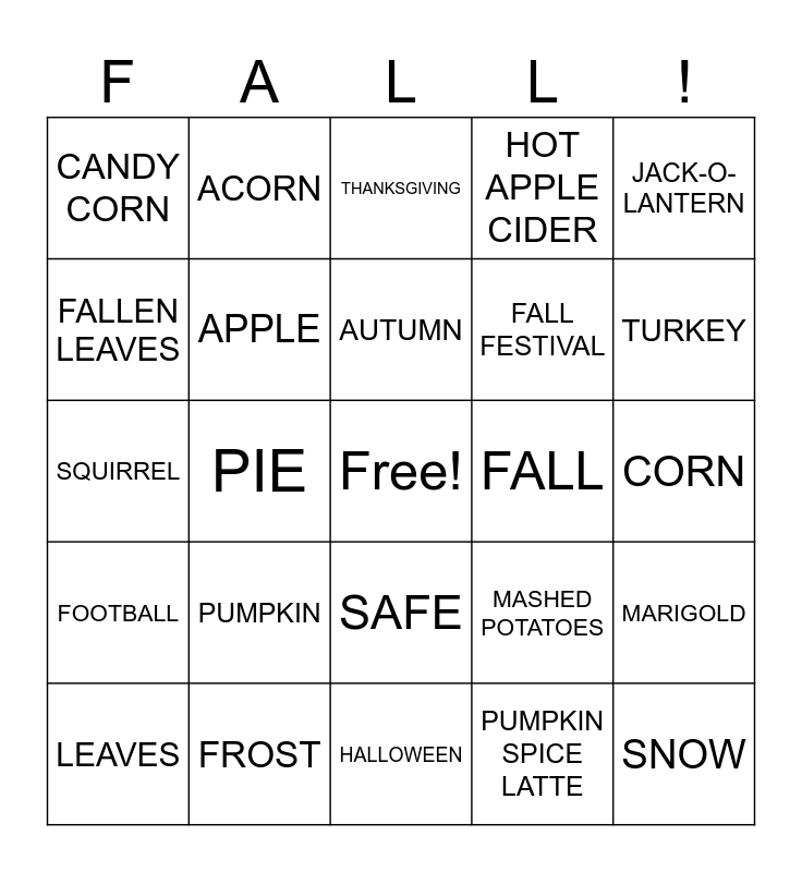 This bingo card has a free space and 24 words: LEAVES, PUMPKIN, AUTUMN, PUMPKIN SPICE LATTE, JACK-O-LANTERN, CANDY CORN, ACORN, THANKSGIVING, FALL, CORN, SQUIRREL, APPLE, MASHED POTATOES, MARIGOLD, FALLEN LEAVES, FROST, HALLOWEEN, HOT APPLE CIDER, TURKEY, FOOTBALL, PIE, SAFE, FALL FESTIVAL and SNOW.