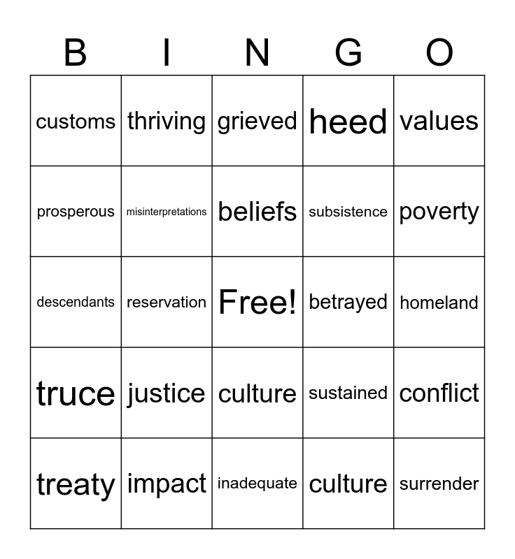 This bingo card has a free space and 26 words: culture, culture, beliefs, impact, values, customs, prosperous, thriving, homeland, sustained, subsistence, descendants, conflict, treaty, reservation, plain words, heed, truce, grieved, surrender, poverty, inadequate, betrayed, justice, misinterpretations and liberty.