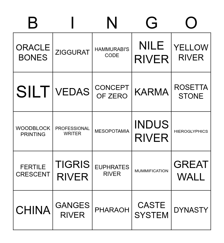 This bingo card has 44 words: Free!, MESOPOTAMIA, EGYPT, CHINA, INDIA, CASTE SYSTEM, HAMMURABI'S CODE, POLYTHEISM, YELLOW RIVER, GANGES RIVER, NILE RIVER, INDUS RIVER, EUPHRATES RIVER, TIGRIS RIVER, AGRICULTURE, PHARAOH, DIVINE RIGHT, WOODBLOCK PRINTING, THE WHEEL, ROSETTA STONE, ZIGGURAT, PYRAMID, MONSOON, ORACLE BONES, SANSKRIT, HIEROGLYPHICS, CUNEIFORM, CATARACTS, MUMMIFICATION, FERTILE CRESCENT, JOB SPECIALIZATION, GREAT WALL, PAPYRUS, CARAVAN, PROFESSIONAL WRITER, COMPASS, BARTER, DYNASTY, CONCEPT OF ZERO, SILT, KARMA, REINCARNATION, VEDAS and BOOK OF THE DEAD.