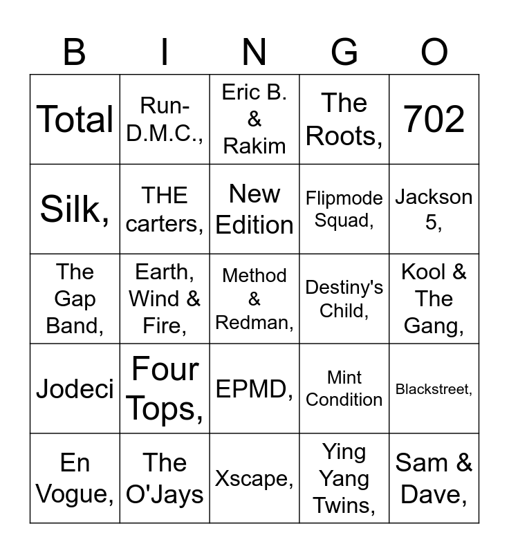 This bingo card has 103 words: Naughty By Nature, Bell Biv DeVoe, 702, The Gap Band, Earth, Wind & Fire, Harold Melvin & The Blue Notes, Xscape, The Stylistics, Gladys Knight & The Pips, The Chi-Lites, Ohio Players, The Miracles, ST. LUNATICS, The Beatnuts, Dead Prez, Clipse, Eric B. & Rakim, SWV, En Vogue, K. K-Ci & JoJo, EPMD, OutKast, Big Tymers,, WU-TUNG, mobb deep,, Four Tops,, Jackson 5,, The Roots,, Ohio Players,, Tony! Toni! Toné!,, Mint Condition, Ying Yang Twins,, Dvsn,, Nwa, no limit soldier,, K-Ci & JoJo and, The Supremes, Kool & The Gang, New Edition, The O'Jays, TLC, Jodeci, Jagged Edge,, Silk,, 702,, Total, O'Jays,, Method & Redman,, jagged edge,, Sam & Dave,, Commodores,, Spinners,, A Tribe Called Quest,, H-Town, UGK,, ST. LUNATICS,, The Beatnuts,, Method & Red,, 8Ball & MJG,, EPMD,, Kool & The Gang,, Jackson 5, Isley Brothers., Naughty By Nature,, pretty ricky, Bell Biv DeVoe,, H-Town,, Run-D.M.C.,, The Gap Band,, Earth, Wind & Fire,, Xscape,, The Stylistics,, Gladys Knight & The Pips,, The Chi-Lites,, The Miracles,, Wu-Tang Clan,, SWV,, En Vogue,, K-Ci & JoJo,, Goodie Mob,, Rae Sremmurd,, G-Unit,, THE carters,, Bone Thugs,, Destiny's Child,, 3-6 MAFIA,, Lox,, 112,, OutKast,, Big Tymers, Total,, hot boyz,, Blackstreet,, jagged edge, D12,, Geto Boys,, Flipmode Squad,, B2K,, Tony! Toni! Toné!, The Whispers,, ruff ryders,, boyz n da hood and TLC,.