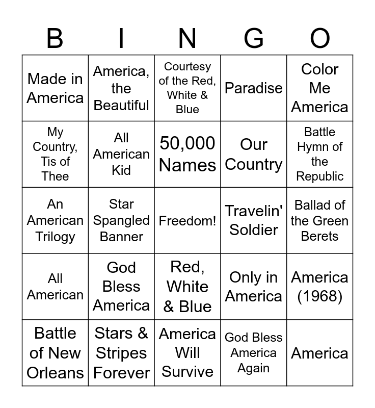 This bingo card has a free space and 42 words: More Than a Name On the Wall, 50,000 Names, God Bless the USA, God Bless America, God Bless America Again, America (1968), America, American Soldier, Courtesy of the Red, White & Blue, Red, White & Blue, Ballad of the Green Berets, Battle Hymn of the Republic, Star Spangled Banner, Color Me America, Where the Stars & Stripes and the Eagle Fly, Only in America, Where Were You (When the World Stopped Turning), An American Trilogy, This Land is Your Land, America, the Beautiful, My Country, Tis of Thee, American Pie, American Woman, Made in America, Pink Houses, Born in the USA, Our Country, You're a Grand Ole Flag, Yankee Doodle, Ragged Old Flag, Folded Flag, All American, All American Kid, America Will Survive, In America, Battle of New Orleans, Stars & Stripes Forever, Travelin' Soldier, Arlington, Til the Last Shot's Fired, Paradise and Some Gave All.