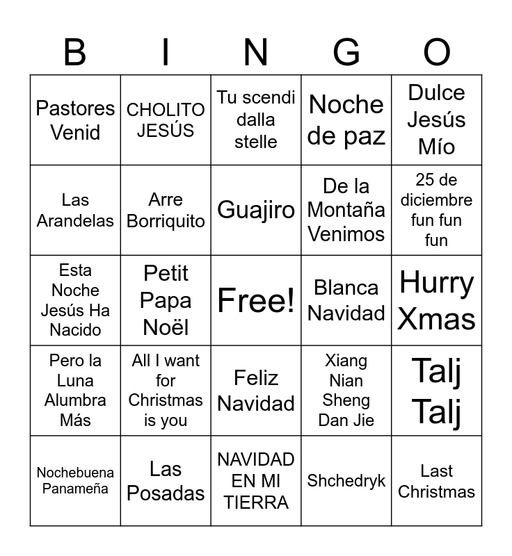 This bingo card has a free space and 36 words: Niñito de Belén, El Encuentro, Boas Festas, Arre Borriquito, Xiang Nian Sheng Dan Jie, Pero la Luna Alumbra Más, Guajiro, Nu det jul igen, Dulce Jesús Mío, Los Peces en el Río, Petit Papa Noël, Noche de paz, El burrito sabanero, Blanca Navidad, 25 de diciembre fun fun fun, Pastores Venid, Jingle Bells, All I want for Christmas is you, Last Christmas, Tu scendi dalla stelle, Hurry Xmas, Talj Talj, Las Posadas, Nochebuena Panameña, NAVIDAD EN MI TIERRA, CHOLITO JESÚS, Esta Noche Jesús Ha Nacido, O Menino que nasceu, De la Montaña Venimos, Las Arandelas, Trei Crai de la Răsărit, V lesu rodilas elochka, Shchedryk, Feliz Navidad, Santa Claus Llego A La Ciudad and Cantemos, cantemos.