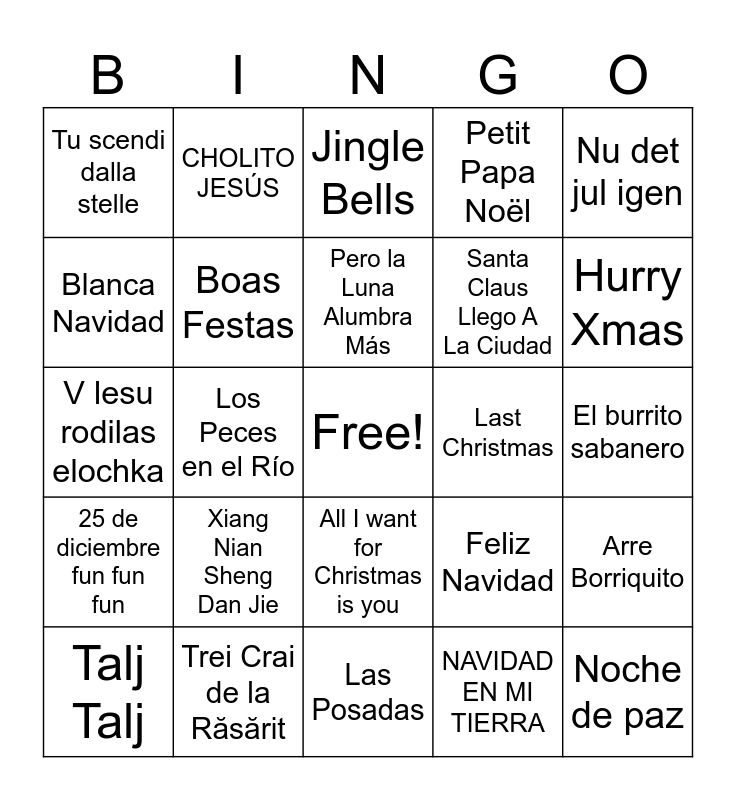 This bingo card has a free space and 37 words: O du fröhliche, Niñito de Belén, El Encuentro, Boas Festas, Arre Borriquito, Xiang Nian Sheng Dan Jie, Pero la Luna Alumbra Más, Guajiro, Nu det jul igen, Dulce Jesús Mío, Los Peces en el Río, Petit Papa Noël, Noche de paz, El burrito sabanero, Blanca Navidad, 25 de diciembre fun fun fun, Pastores Venid, Jingle Bells, All I want for Christmas is you, Last Christmas, Tu scendi dalla stelle, Hurry Xmas, Talj Talj, Las Posadas, Nochebuena Panameña, NAVIDAD EN MI TIERRA, CHOLITO JESÚS, Esta Noche Jesús Ha Nacido, O Menino que nasceu, De la Montaña Venimos, Las Arandelas, Trei Crai de la Răsărit, V lesu rodilas elochka, Shchedryk, Feliz Navidad, Santa Claus Llego A La Ciudad and Cantemos, cantemos.