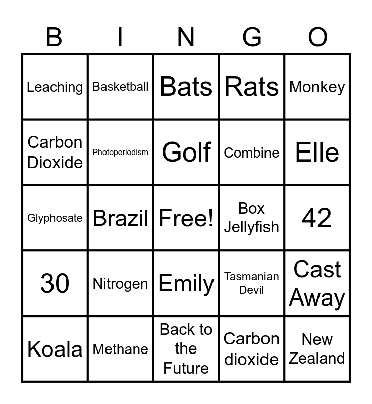 This bingo card has a free space and 24 words: Nitrogen, Methane, Golf, Koala, Monkey, Leaching, Carbon Dioxide, Basketball, Box Jellyfish, Emily, Combine, Glyphosate, Tasmanian Devil, Cast Away, Photoperiodism, Carbon dioxide, 42, Bats, Elle, Brazil, New Zealand, 30, Rats and Back to the Future.