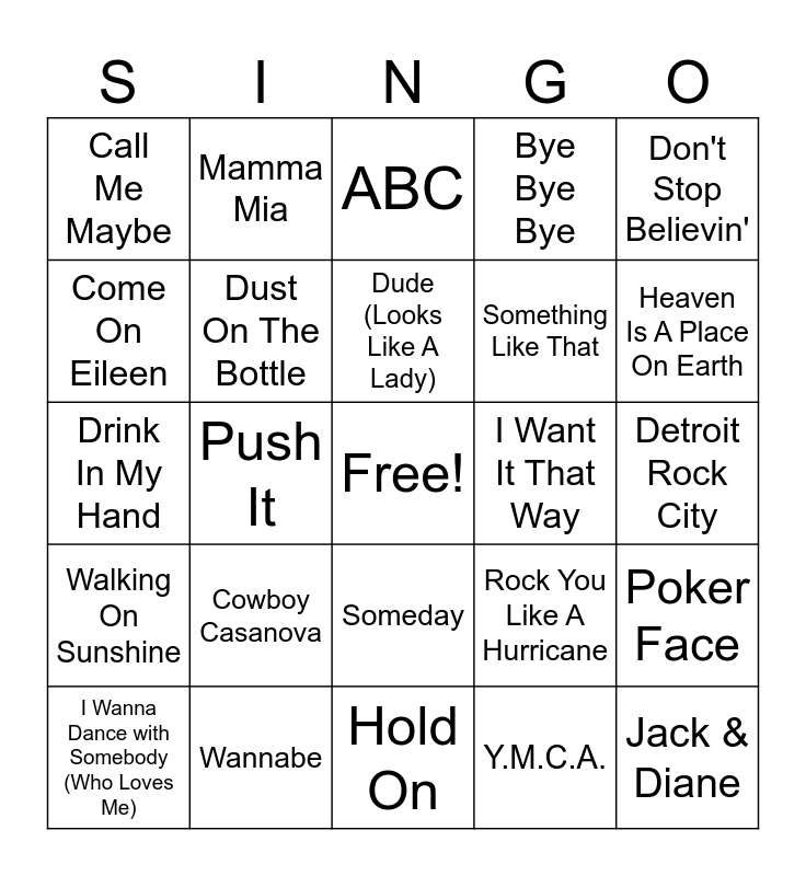This bingo card has a free space and 79 words: 867-5309, 9 to 5, ABC, All Star, All Summer Long, Any Way You Want It, Baby, Bad Moon Rising, Basket Case, Believe, Bohemian Rhapsody, Bring Me To Life, Bye Bye Bye, Call Me Maybe, Celebration, Come On Eileen, Country Girl, Cowboy Casanova, Dancing Queen, Detroit Rock City, Don't Bring Me Down, Don't Stop Believin', Drink In My Hand, Dude (Looks Like A Lady), Dust On The Bottle, Edge of Seventeen, Every Morning, Fly, Get the Party Started, Girls Just Want to Have Fun, Heaven Is A Place On Earth, Hey Ya!, Hold On, I Love Rock 'N Roll, I Wanna Dance with Somebody (Who Loves Me), I Want It That Way, I'll Be There for You, I'm Gonna Be (500 Miles), It's Raining Men, Jack & Diane, Lean On, Let's Groove, Life is a Highway - From "Cars", Love Shack - Edit; 2019 Remaster, Mambo No. 5, Mamma Mia, Man! I Feel Like A Woman!, Material Girl, Never Gonna Give You Up, New Rules, Poker Face, Push It, Rock You Like A Hurricane, Seven Nation Army, SexyBack, Shake It Off, Since U Been Gone, Single Ladies, Smells Like Teen Spirit, Someday, Something Like That, Stacy's Mom, Sympathy For The Devil, That's the Way It Is, The Power Of Love, Troublemaker, Uprising, Uptown Funk (feat. Bruno Mars), Uptown Girl, Walking On Sunshine, Wannabe, We Are Never Ever Getting Back Together, We Didn't Start the Fire, We Found Love, What's Love Got to Do with It, Y.M.C.A., You Give Love A Bad Name, You Shook Me All Night Long and Your Love.