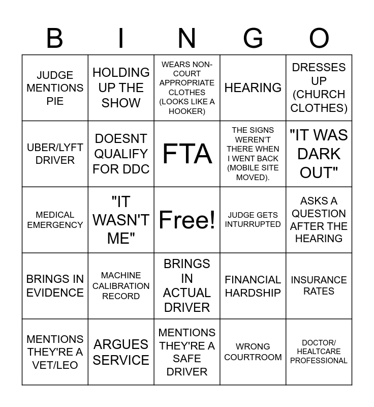 This bingo card has a free space and 36 words: DISMISS ID, ASKS FOR LENIENCY, USES THE WRONG DOOR, DOESNT QUALIFY FOR DDC, FINANCIAL HARDSHIP, BRINGS IN EVIDENCE, FTA, POINTS, DRESSES UP (CHURCH CLOTHES), BRINGS A PARENT, "IT WASN'T ME", HEARING, THE SIGNS WERENT OUT, JUDGE GETS INTURRUPTED, "IT WAS DARK OUT", JUDGE MENTIONS PIE, BALIFF EXCHANGE, MACHINE CALIBRATION RECORD, DOCTOR/ HEALTCARE PROFESSIONAL, WEARS NON-COURT APPROPRIATE CLOTHES (LOOKS LIKE A HOOKER), ASKS A QUESTION AFTER THE HEARING, INSURANCE RATES, ARGUES SERVICE, MENTIONS THEY'RE A VET/LEO, MENTIONS THEY'RE A SAFE DRIVER, HOLDING UP THE SHOW, MEDICAL EMERGENCY, HAS MULTIPLE CASES, THE SIGNS WEREN’T THERE WHEN I WENT BACK (MOBILE SITE MOVED)., UBER/LYFT DRIVER, CRIES, DEFENDANTS TESTIMONY DOESN'T MAKE SENSE, WRONG COURTROOM, BRINGS IN ACTUAL DRIVER, RATS ON DRIVER (UNPROMPTED) and HAS A CDL.
