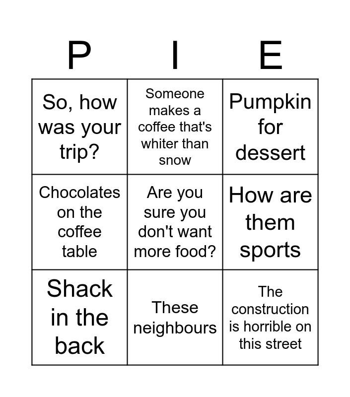 This bingo card has 20 words: the kids get a gift, go go board games, Pumpkin for dessert, Tablecloth has turkeys on it, Electric Knife, Are you sure you don't want more food?, What are you thankful for?, So, how was your trip?, The construction is horrible on this street, Someone makes a coffee that's whiter than snow, Someone has a meltdown, Are there new toys?, How are them sports, The squirrels keep eating the bird seeds, Shack in the back, Marshmallows on sweet potatoes but only half, These neighbours, Chocolates on the coffee table, World famous carrots and Someone shouts gobble gobble.