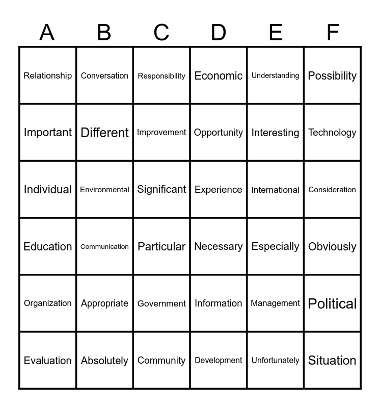This bingo card has 36 words: Information, Government, Development, Important, Education, Experience, Different, Community, Understanding, Management, Technology, Economic, Political, Environmental, Opportunity, Relationship, Organization, International, Individual, Responsibility, Significant, Communication, Necessary, Particular, Especially, Conversation, Interesting, Absolutely, Improvement, Possibility, Situation, Evaluation, Obviously, Consideration, Appropriate and Unfortunately.