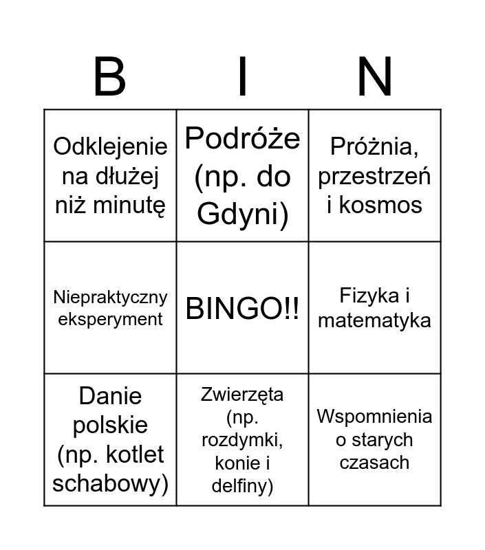 This bingo card has a free space and 8 words: Fizyka i matematyka, Próżnia, przestrzeń i kosmos, Podróże (np. do Gdyni), Danie polskie (np. kotlet schabowy), Odklejenie na dłużej niż minutę, Wspomnienia o starych czasach, Niepraktyczny eksperyment and Zwierzęta (np. rozdymki, konie i delfiny).