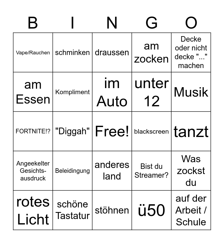 This bingo card has a free space and 24 words: Beleidingung, schöne Tastatur, im Auto, rotes Licht, Decke oder nicht decke "..." machen, Vape/Rauchen, am Essen, schminken, blackscreen, anderes land, unter 12, FORTNITE!?, Bist du Streamer?, Was zockst du, Kompliment, ü50, tanzt, draussen, Musik, "Diggah", auf der Arbeit / Schule, Angeekelter Gesichts-ausdruck, am zocken and stöhnen.