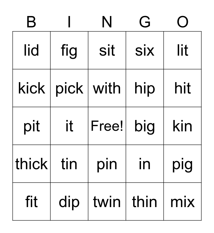 This bingo card has a free space and 35 words: sick, fin, fix, pick, pin, six, kick, win, with, wig, pit, lit, kit, bin, lid, big, thin, it, thick, mix, in, fit, pig, dip, sit, hit, rip, dig, hip, kin, lick, twin, tin, fig and wit.