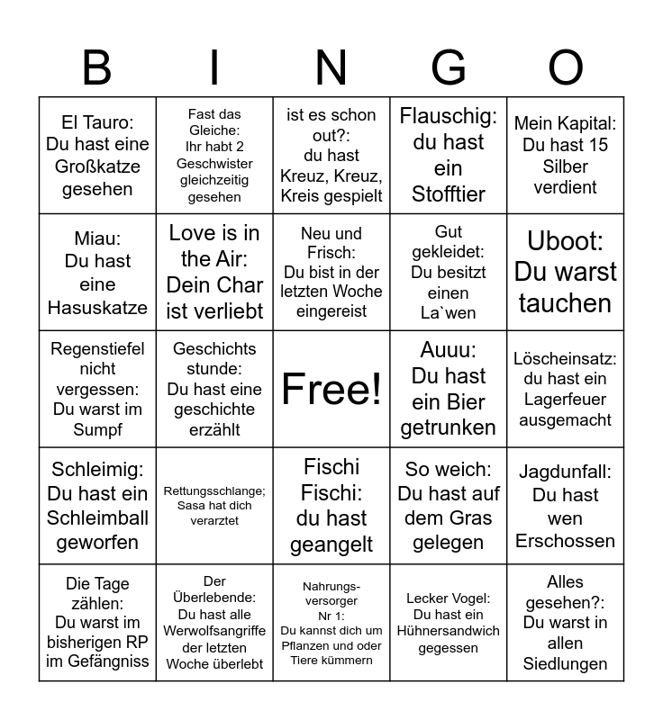 This bingo card has a free space and 24 words: Rettungsschlange; Sasa hat dich verarztet, Der Überlebende: Du hast alle Werwolfsangriffe der letzten Woche überlebt, Neu und Frisch: Du bist in der letzten Woche eingereist, Die Tage zählen: Du warst im bisherigen RP im Gefängniss, Mein Kapital: Du hast 15 Silber verdient, El Tauro: Du hast eine Großkatze gesehen, Miau: Du hast eine Hasuskatze, Fast das Gleiche: Ihr habt 2 Geschwister gleichzeitig gesehen, Auuu: Du hast ein Bier getrunken, Fischi Fischi: du hast geangelt, Gut gekleidet: Du besitzt einen La`wen, Regenstiefel nicht vergessen: Du warst im Sumpf, So weich: Du hast auf dem Gras gelegen, Jagdunfall: Du hast wen Erschossen, Love is in the Air: Dein Char ist verliebt, Lecker Vogel: Du hast ein Hühnersandwich gegessen, Löscheinsatz: du hast ein Lagerfeuer ausgemacht, ist es schon out?: du hast Kreuz, Kreuz, Kreis gespielt, Uboot: Du warst tauchen, Geschichts stunde: Du hast eine geschichte erzählt, Alles gesehen?: Du warst in allen Siedlungen, Schleimig: Du hast ein Schleimball geworfen, Flauschig: du hast ein Stofftier and Nahrungs-versorger Nr 1: Du kannst dich um Pflanzen und oder Tiere kümmern.