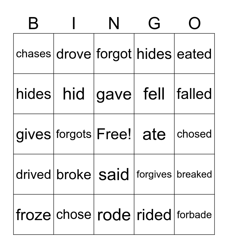 This bingo card has a free space and 24 words: broke, chose, gave, froze, eated, chases, hides, drove, ate, said, fell, gives, forgives, breaked, hid, rided, chosed, forgot, falled, forgots, forbade, drived, hides and rode.
